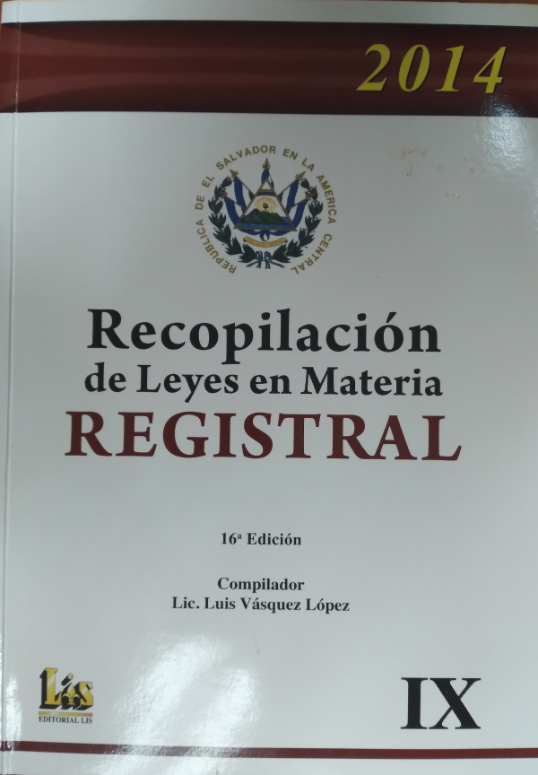 Constitución de El Salvador; Decreto de Creación del Centro Nacional de Registros y su Régimen Administrativo; Decreto que Declara al Centro Nacional de Registros como Institución Pública con Autonomía Administrativa y Financiera; Decreto que autoriza al Consejo Directivo del Centro Nacional de Registros, para que pueda tomar medidas necesarias en caso de emergencia; Ley de la Dirección General de Registros; Ley Especial de procedimientos uniformes para la presentación, tramite y registro o deposito de instrumentos en los registros de la propiedad raíz e hipotecas, social de inmuebles de comercio y de propiedad intelectual; Ley de Registro de Comercio; Reglamento de la Ley de Registro de Comercio; Disposición del Código Civil relacionadas con a función registral; Ley relativa a las tarifas y otras disposiciones administrativas del Registro de la Propiedad Raíz e Hipotecas; Ley de reestructuración del Registro de la Propiedad Raíz e Hipotecas; Reglamento de la Ley de Reestructuración de la Propiedad Raíz e Hipotecas; Decreto que establece que los inmuebles a cualquier título de conformidad con la Ley Básica de la Reforma Agraria, la Ley para la Afectación y Traspaso de Tierras Agrícolas a favor de sus cultivadores directos se inscribirán en el Registro de la Propiedad Raíz e Hipotecas, libres de todo Gravamen y medida cautelas con los afecten; Decreto mediante se autoriza el Sistema de Fotocopia para hacer las inscripciones en el Registro de la Propiedad Raíz e Hipotecas; Decreto de Creación del instituto de Legalización de la Propiedad; Reglamento para la Calificación de Proyectos de Interés Social por parte del Instituto de Legalización de la Propiedad; Decreto de creación de un Programa Especial denominado "El Salvador, país de propietarios"; Ley de creación de la Unidad del Registro Social de Inmuebles; Reglamento de la Ley de Creación de la Unidad del Registro Social e Inmuebles; Decreto Ejecutivo de Ampliación de la Competencia de la Unidad del Registro Social de Inmuebles; Creación de la Oficina Coordinadora de Células Registrales Móviles; Ley de la Propiedad Intelectual; Reglamento de la Ley de Fomento y Protección de la Propiedad Intelectual; Ley de Marcas y otros Signos Distintivos; Arreglo de Niza relativo a la Clasificación Internacional de Productos y Servicios para el Registro de las Marcas; Clasificación de Niza; Ley de Constitución de Servidumbres para las Obras de Electrificación Nacional; Ley del Notariado; Ley del Ejercicio Notarial de las Jurisdicción Voluntaria y de Otras Diligencias; Ley Especial Transitoria de Inscripción de Acotamiento de Inmuebles que forman parte de la Carretera Longitudinal del Norte; Ley de Ingenieros Topógrafos; Ley de Catastro; Ley Especial de Lotificaciones y de Parcelaciones para uso habitacional; Reglamento de la Ley Especial de Lotificaciones y de Parcelaciones para uso habitacional; Ley Especial para Diligencias de Legalización de Derechos de Propiedad y Regularización de la Propiedad a personas de Escasos Recursos Económicos y Personas afectadas por fenómenos naturales; Ley para la desafectación y traspaso de los terrenos del tramo ferroviario en desuso a favor de las familias e instituciones que las habitan; Ley Especial para la desafectación y Transferencia de los terrenos ferroviarios en Desuso y sin viabilidad Ferroviaria, a favor de las familias y entidades de utilidad pública que las habitan; Ley Especial de agilización de trámites para el Fomento de Proyectos de Construcción